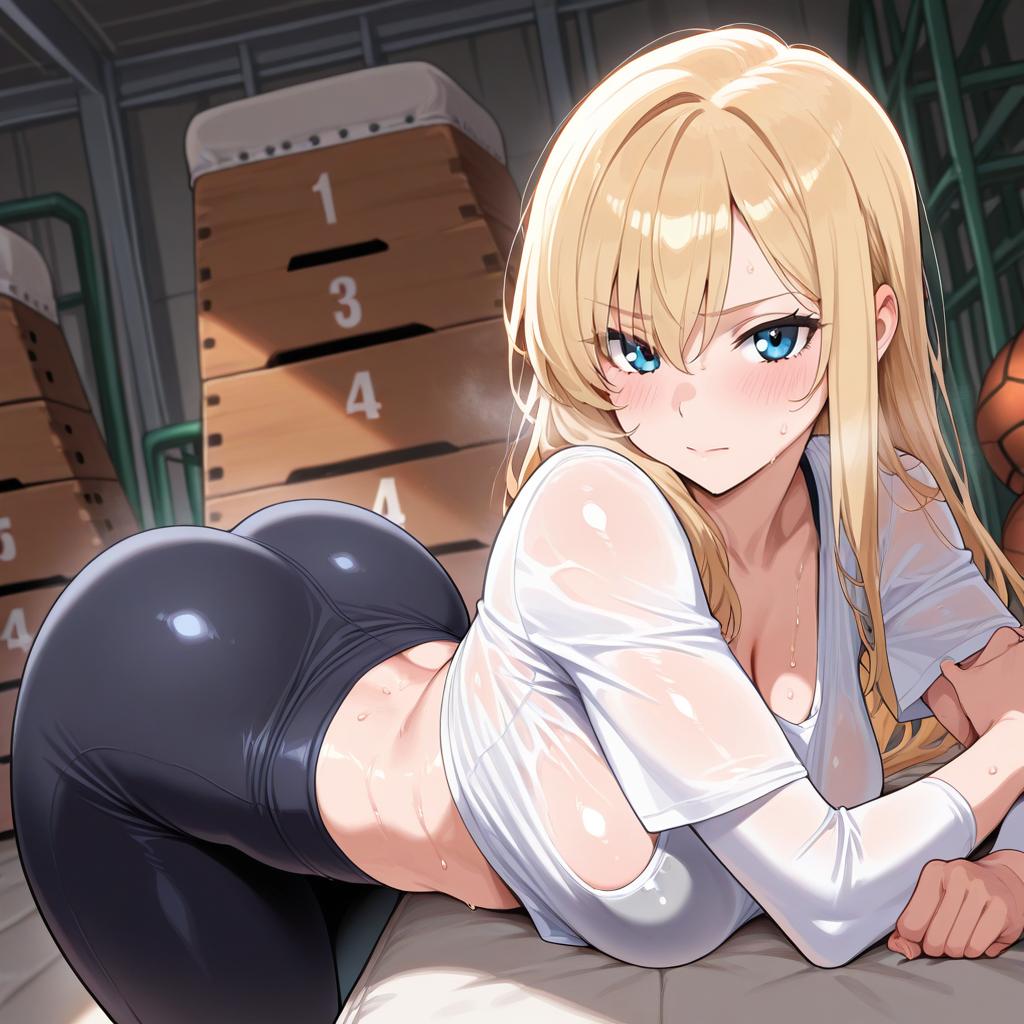 (masterpiece, best quality), 1girl, athletic, gym storeroom, sweat, see-through, blonde, freckles, blush, (oversized crop top), twisted torso, (muscular:0.6), long hair, looking at viewer, embarrassed, (sweat), leggings, pov