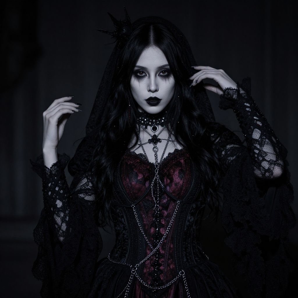 A woman dressed in an intricate gothic outfit with lace and chain details poses in a dimly lit setting, emphasizing a somber and mysterious atmosphere. Her pale complexion, dark makeup, and intense gaze enhance the dark, moody aesthetic typical of gothic fashion photography.
