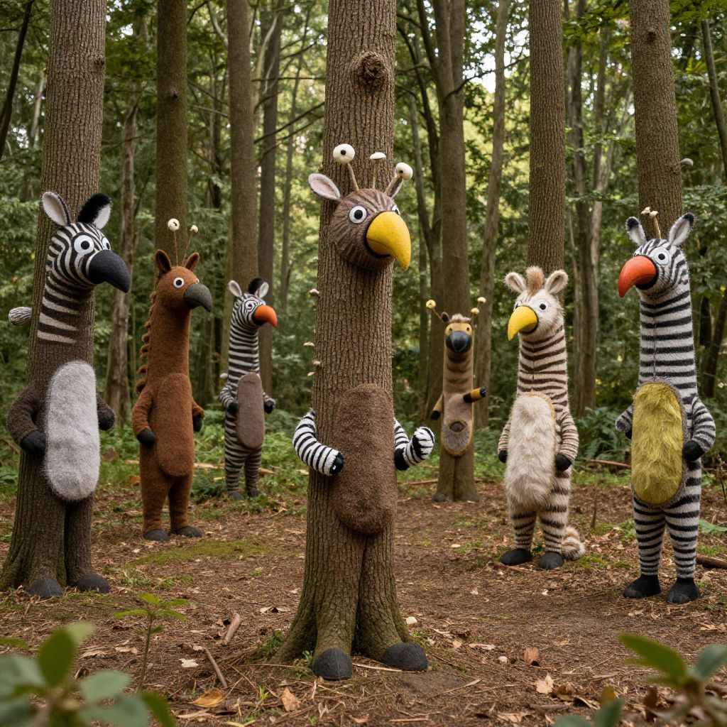 Photograph of a whimsical forest scene featuring eight stuffed animal puppets, each with unique zebra-like and animal characteristics, standing among tall trees with dense green foliage. The puppets, made of soft fabric, display a mix of zebra stripes, brown fur, and yellow beaks, with some having fluffy yellow chests or tails. One puppet is hugging a tree trunk in the center, while others stand around, creating a playful, forest-dwelling group. The forest floor is covered in brown leaves and small plants, adding texture and depth to the scene. The overall atmosphere is playful and imaginative.