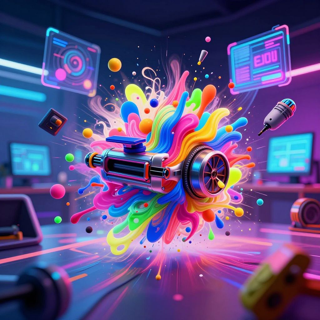 A vibrant, digital CGI image depicting a dynamic explosion of colorful, neon-like splashes surrounding two cylindrical objects, resembling car exhaust pipes, in the center. The background features a futuristic, neon-lit room with blurred screens displaying pink and blue text. Bright, multicolored shapes and particles, including spheres and exclamation marks, burst outward from the center. The scene has a high-energy, cyberpunk aesthetic with vivid hues, sharp contrasts, and a sense of motion. The image is richly detailed with glowing highlights and a sense of depth.