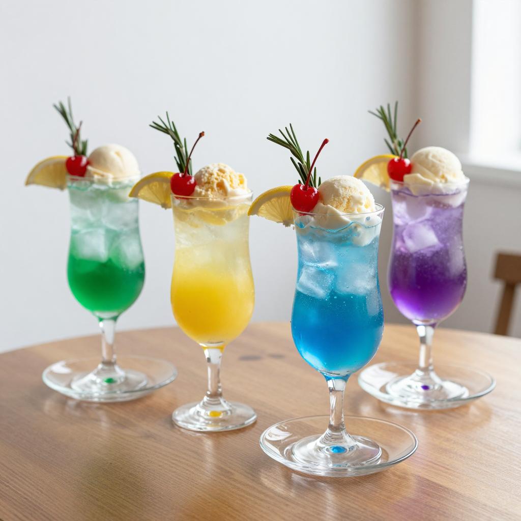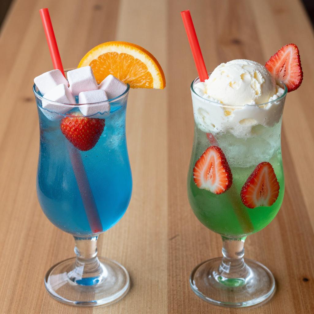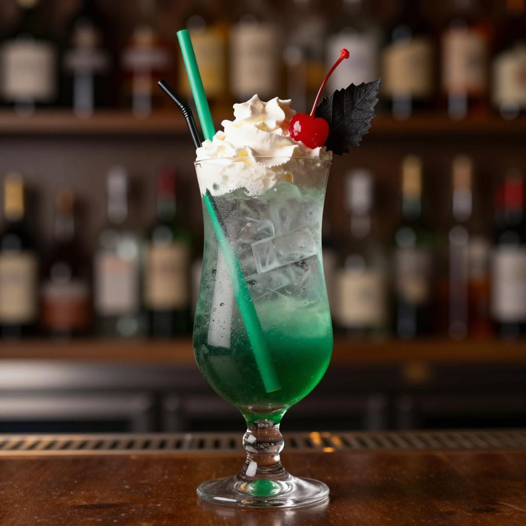 Two tall, curvy glasses of green iced drinks with white foam and orange scoops on top, each with a red cherry. On a dark wooden table, one glass has a spoon, the other has a napkin and glasses. Blurred indoor background with soft lighting.