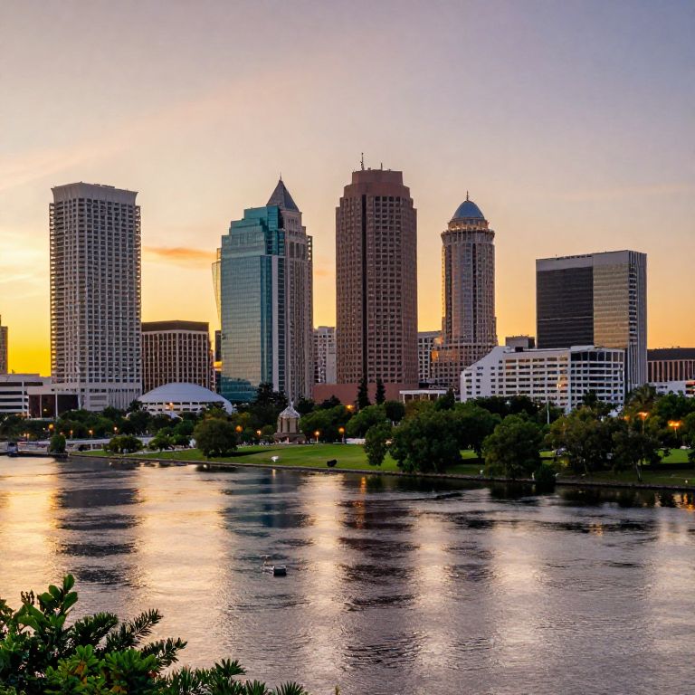 Jacksonville cityscape at sunset, vibrant skyline with modern skyscrapers and riverfront, reflections on water, lush green parks, dynamic urban vibe, warm golden hour lighting, detailed architecture, realistic style