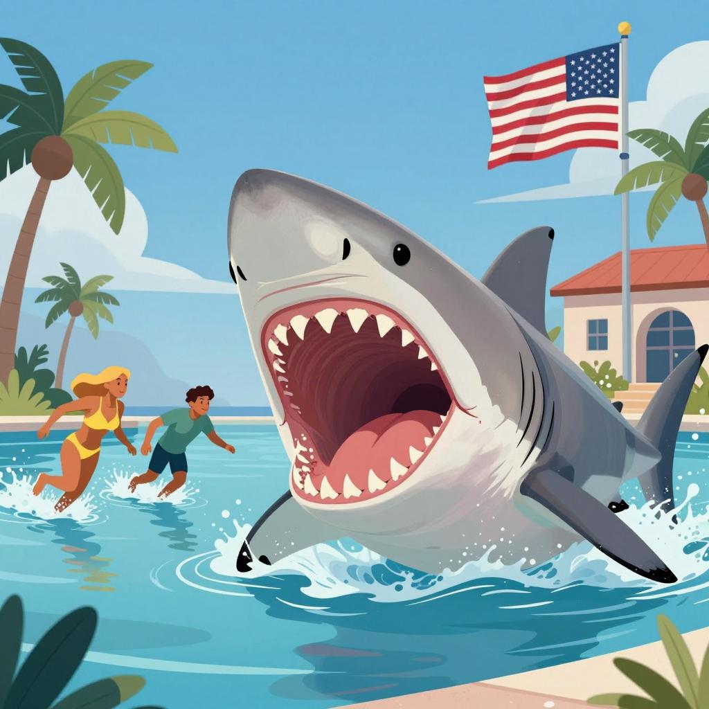 Digital illustration of a large shark with open mouth and sharp teeth emerging from a blue pool. Two people, a woman with tan skin, blonde hair, and a yellow bikini, and a man with tan skin, dark hair, and a green shirt, are swimming away on the left. Palm trees and a building with an American flag on a pole are in the background. The shark's mouth is centered, water splashing around it.