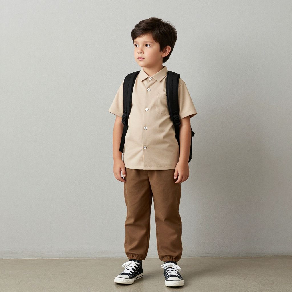 Photograph of a young Asian boy standing against a plain, light grey background. He has short, dark brown hair and is looking to the left with a thoughtful expression. He wears a beige short-sleeved button-up shirt, brown pants, and black-and-white sneakers. A black backpack is slung over his shoulders. The floor is a light grey concrete, and the overall lighting is soft, creating minimal shadows. The boy's posture is slightly slouched, and he stands with his arms relaxed by his sides. The image has a realistic, slightly digital style with subtle texturing on the clothing.