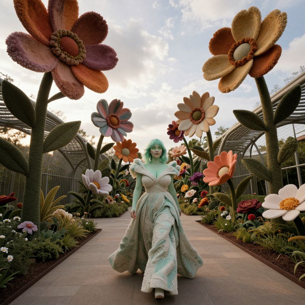 A cinematic wide-angle photograph of a textile flower explosion in a modern botanical garden, where 3D floral couture is woven into the environment—flowers that look like fabric sculptures bloom from tree trunks and arched walkways. A radiant woman with a light green complexion and bright green eyes steps forward, wearing an avant-garde gown that pulses with texture and movement. The sky is partially overcast with soft clouds, and golden hour light enhances the depth and realism of the textile blooms.. The woman has big tits and cute face
