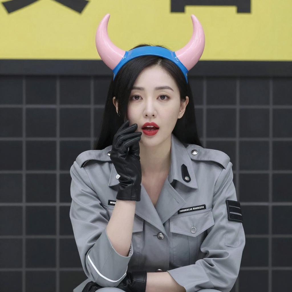 Photograph of an Asian woman with pale skin and black hair, wearing a futuristic, light green, zip-up jacket with black straps and gloves. She has pink, horn-like headpieces and red lipstick, posing with her finger to her lips. The background features a black tiled wall with a yellow, hazardous sign.