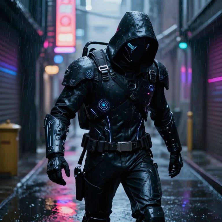 Cyberpunk soldier in black, wet, hooded suit with glowing blue circles, walking down neon-lit, rainy alley at night. Digital art