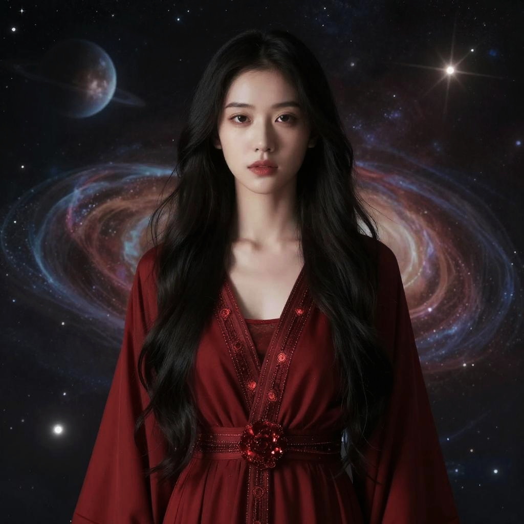 Digital art of a pale-skinned woman with long, flowing black hair tinged with red, standing in a mystical, dark night sky filled with stars and a galaxy. She wears a black, lace-trimmed dress that highlights her slender figure. Red, glowing flowers with translucent petals surround her, casting an ethereal light. Her expression is serene yet intense, and her eyes gaze directly at the viewer. The image combines elements of fantasy and surrealism, with a focus on contrast between the dark, cosmic background and the vibrant, luminescent flowers.