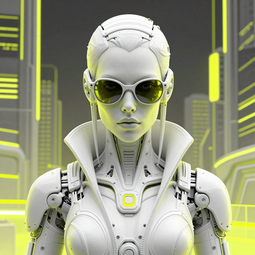 This is a CGI image of a futuristic, humanoid female robot with a sleek, white, cybernetic body. She has a metallic, smooth head with a high-tech visor and wears large, black sunglasses. Her shoulders and chest are adorned with intricate, mechanical details and glowing yellow accents. She has a high-collared, robotic chest plate with a glowing yellow square in the center. The background features a neon-lit, cyberpunk cityscape with tall, illuminated skyscrapers and bright yellow lights, enhancing the futuristic and high-tech atmosphere. The overall color palette is dominated by white, yellow, and black.
