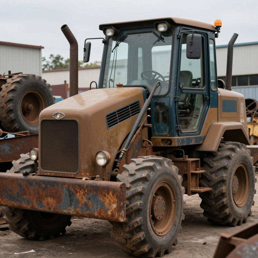 Close-up of an anthropomorphic road grader with a vigilant expression, painted in faded bronze and dark teal colors. The machinery is situated in an urban junkyard setting, surrounded by rusty industrial equipment and large tires, emphasizing a weathered and vintage industrial atmosphere.