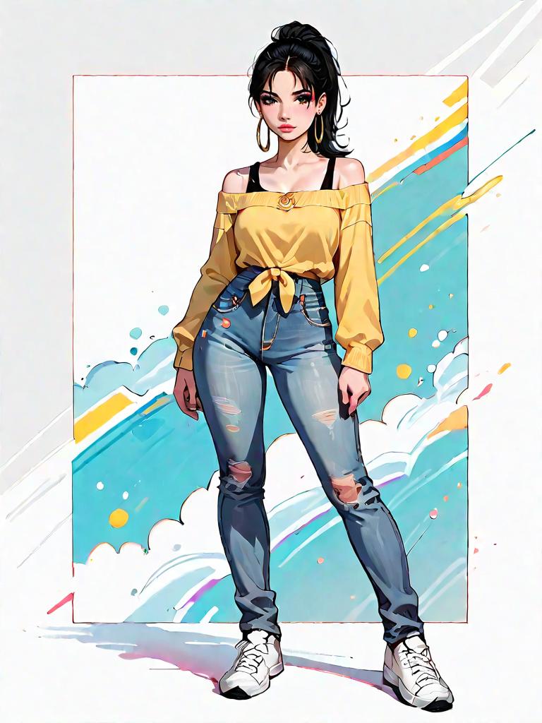 1girl, source_comics, realistic face, full body shot, Woman, casual, denim shirt with rolled-up sleeves and a pointed collar, front button closure, two chest pockets, paired with black slim-fit faux leather pants, accessorized with a slim patterned belt, hair loosely worn down.
