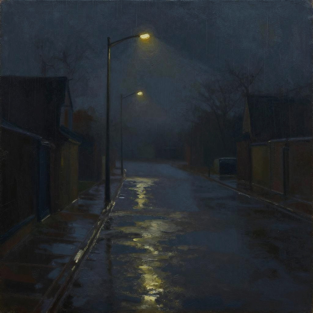 Melancholic solitude painting depicting an empty deserted street under rain, dim streetlights casting long shadows, oil on canvas, deep melancholic atmosphere