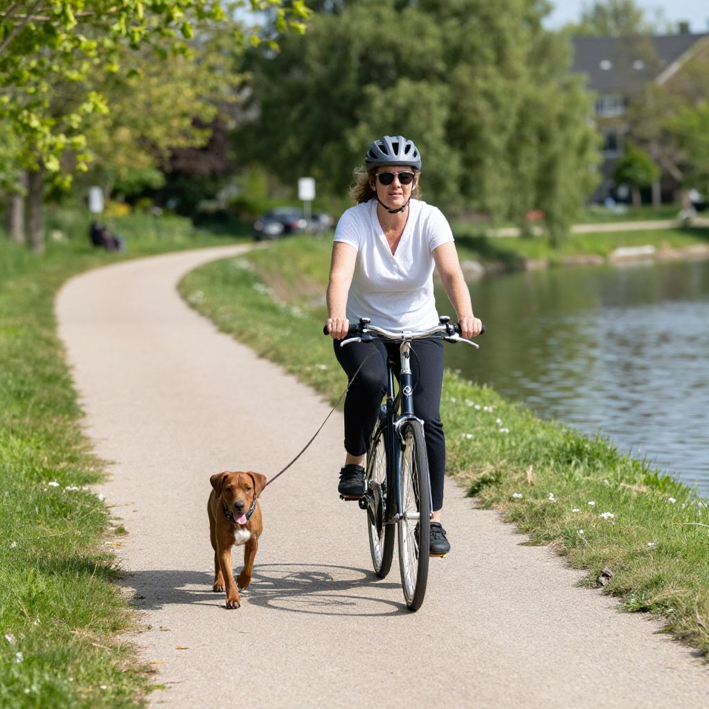 Woman cycling along a serene canal path while her brown dog trots alongside on a leash, enjoying a sunny day in a lush green landscape.