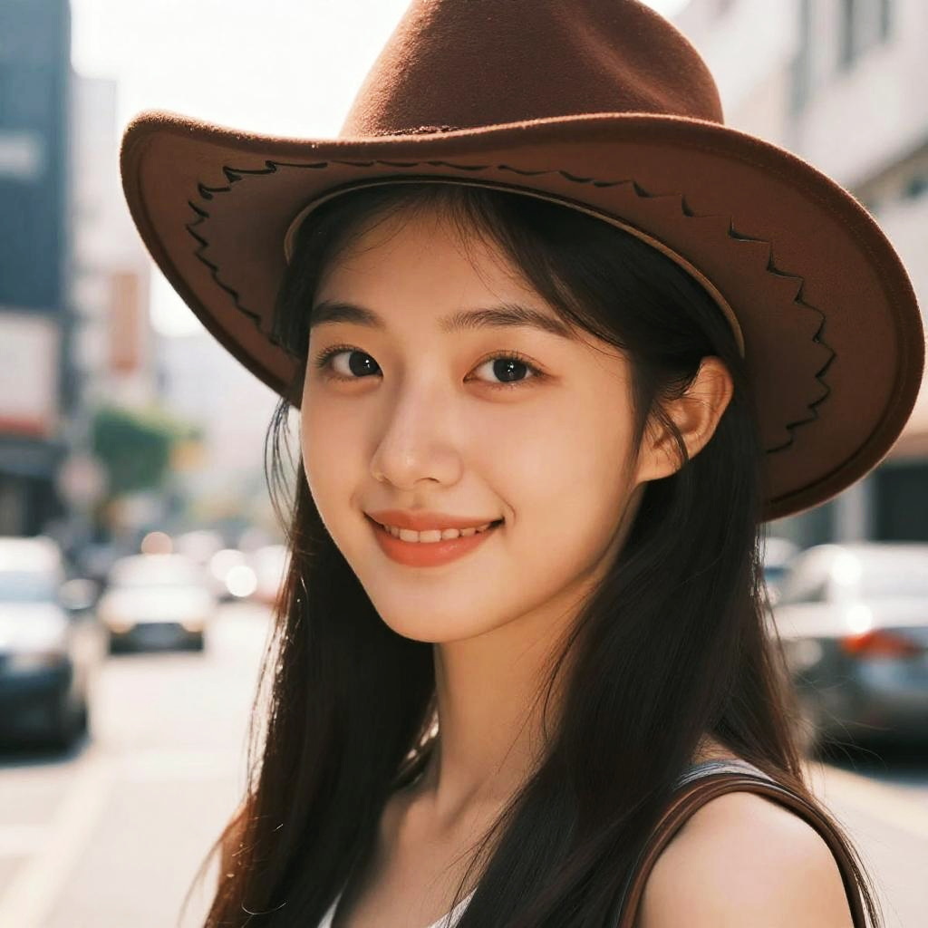 Smiling Korean Girl Wearing Brown Cowboy Hat in City