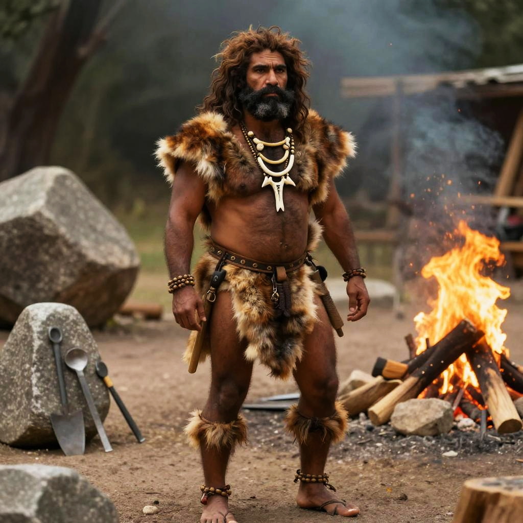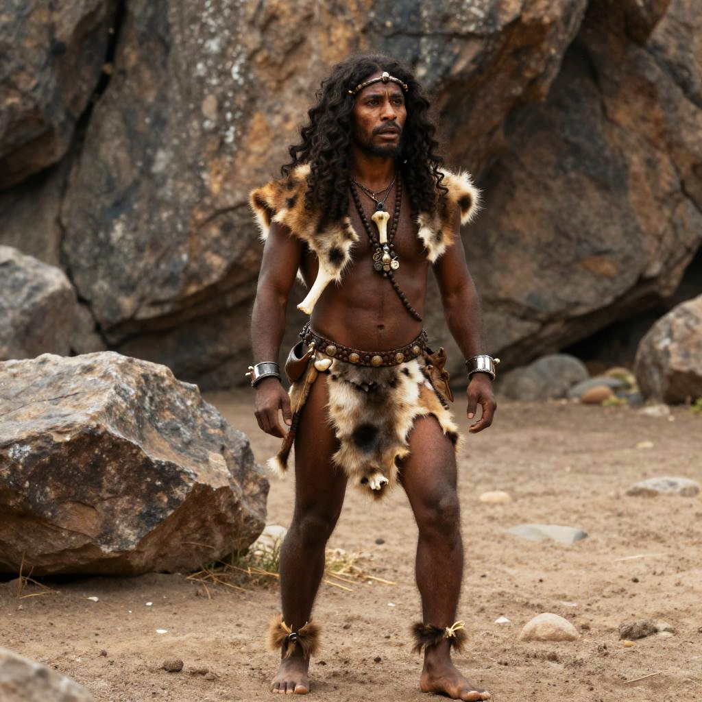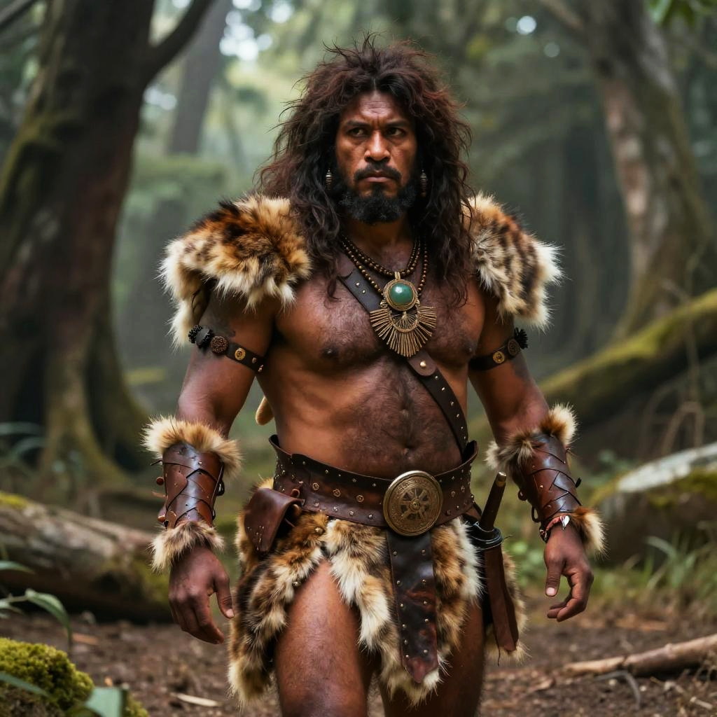 Caveman attire rugged and primitive, with animal furs and leather strips, wild hair, tribal jewelry, standing in prehistoric forest, realistic, detailed textures