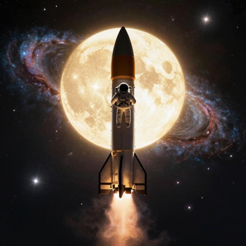 Astronaut riding rocket illuminated by a massive glowing star, silhouette against vast galaxy, soft glowing light effects, detailed rocket machinery, dreamy space fantasy atmosphere, digital painting style