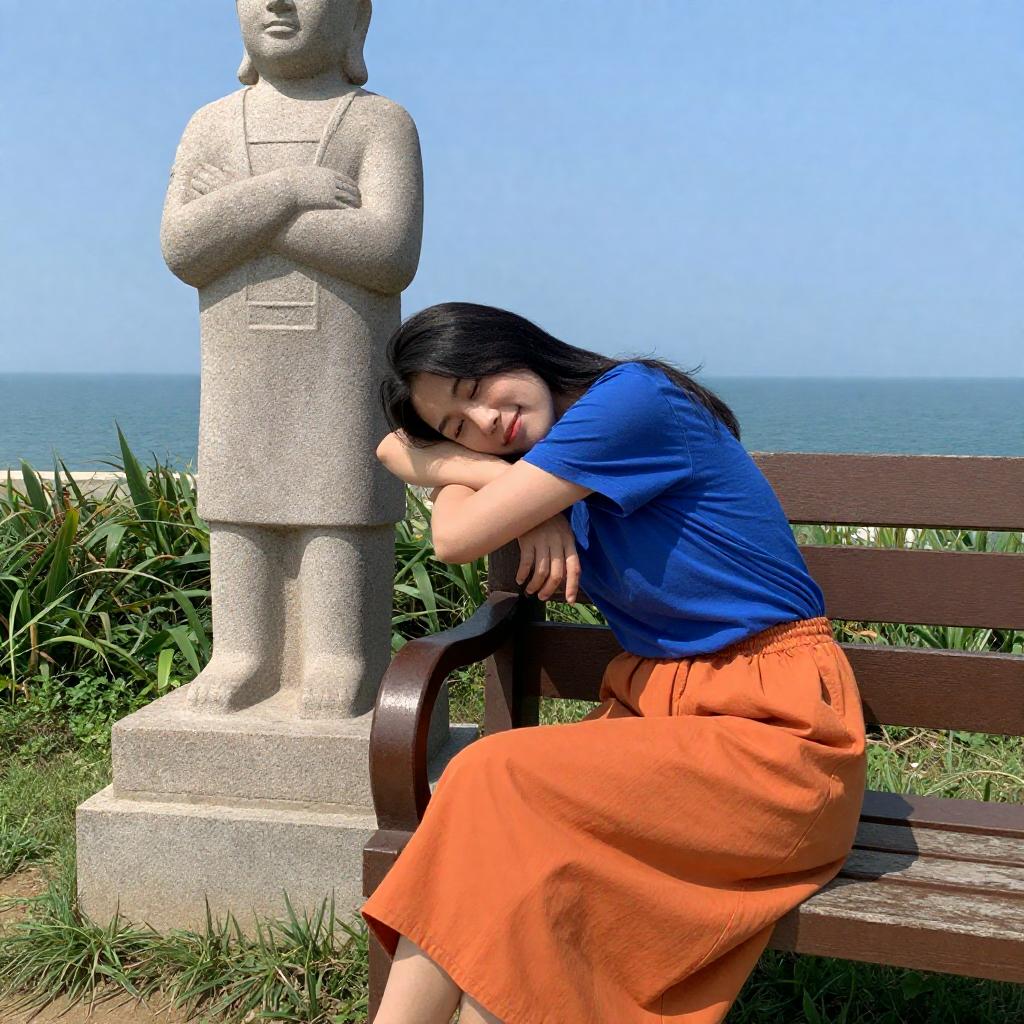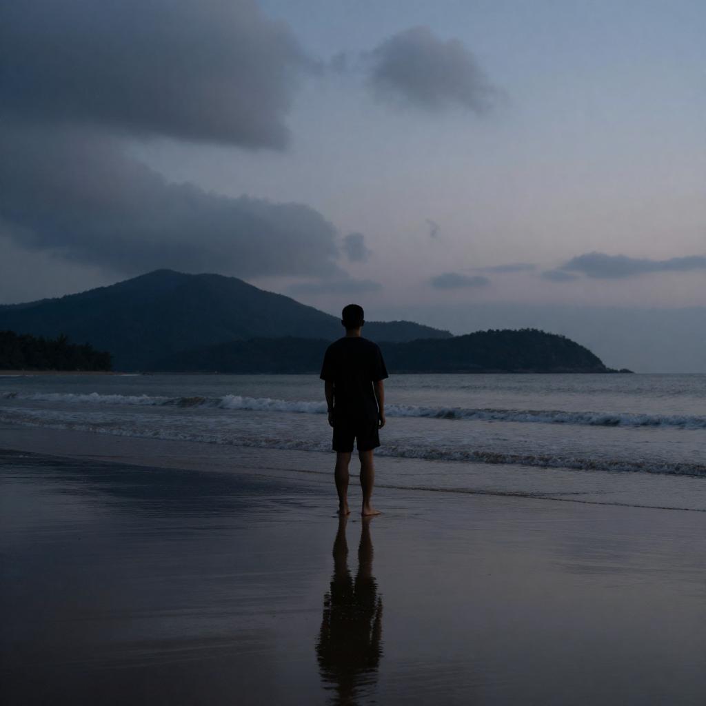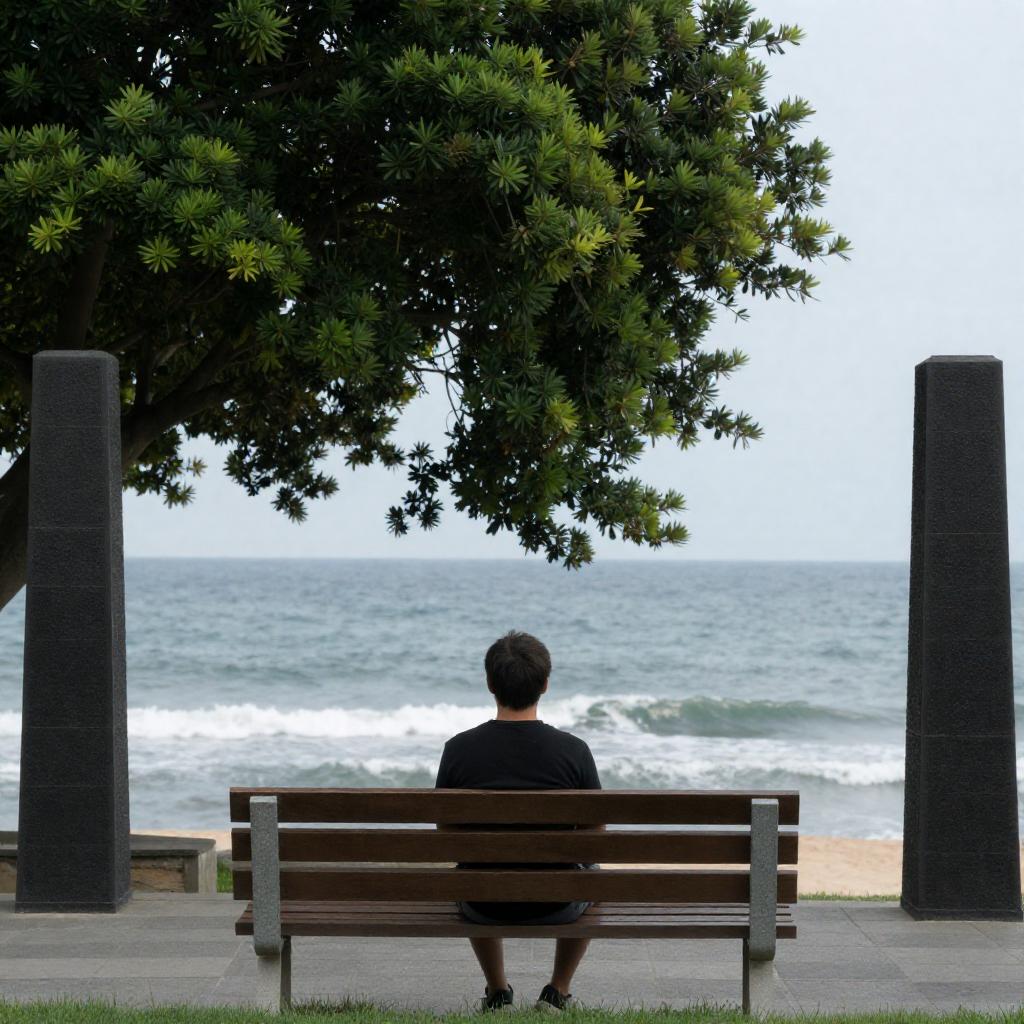 Photograph of a person standing on a wooden deck, overlooking the ocean. The person has short dark hair, wears sunglasses, a dark jacket, black pants, and sandals. They hold a white folder in their right hand. The person is in profile, facing the ocean. The deck has a white pillar to the right and greenery in the background. Clear blue sky.
