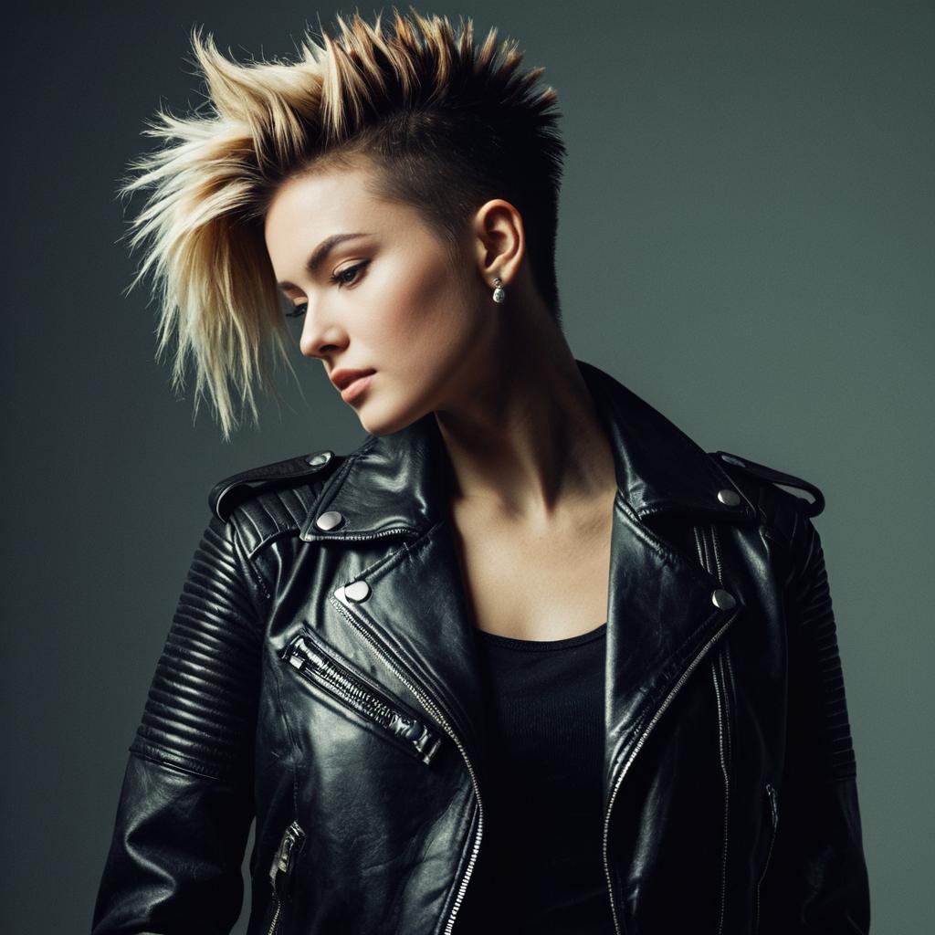 Studio portrait of a young female fashion model with a faux hawk fade hairstyle, wearing a black leather jacket and black top. The image is captured in a fashion editorial style with soft ambient lighting, highlighting the edgy and modern look of the subject against a neutral background.
