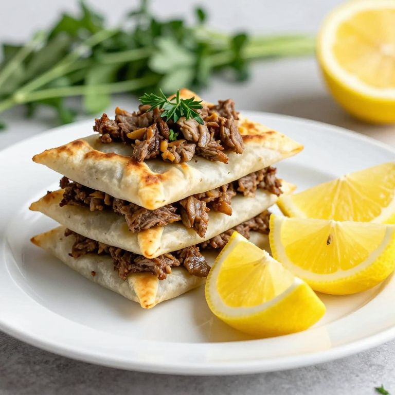 Stacked Turkish Gozleme filled with savory lamb, presented on a white plate alongside three vibrant lemon wedges, garnished with fresh herbs in the background.