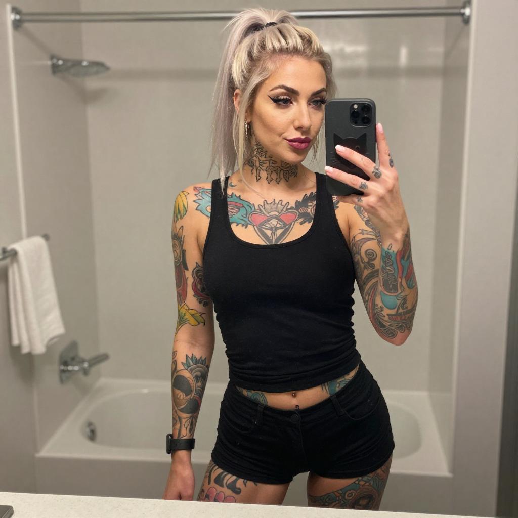 Photograph of a tattooed woman with long, straight, light brown hair, wearing a black tank top and light blue jeans with her hand in her pocket. She holds a black smartphone in her right hand, taking a mirror selfie. She has extensive tattoos on her arms and neck, a gold bracelet on her left wrist, and a visible Calvin Klein waistband. The background includes a white wall and a dark rug.