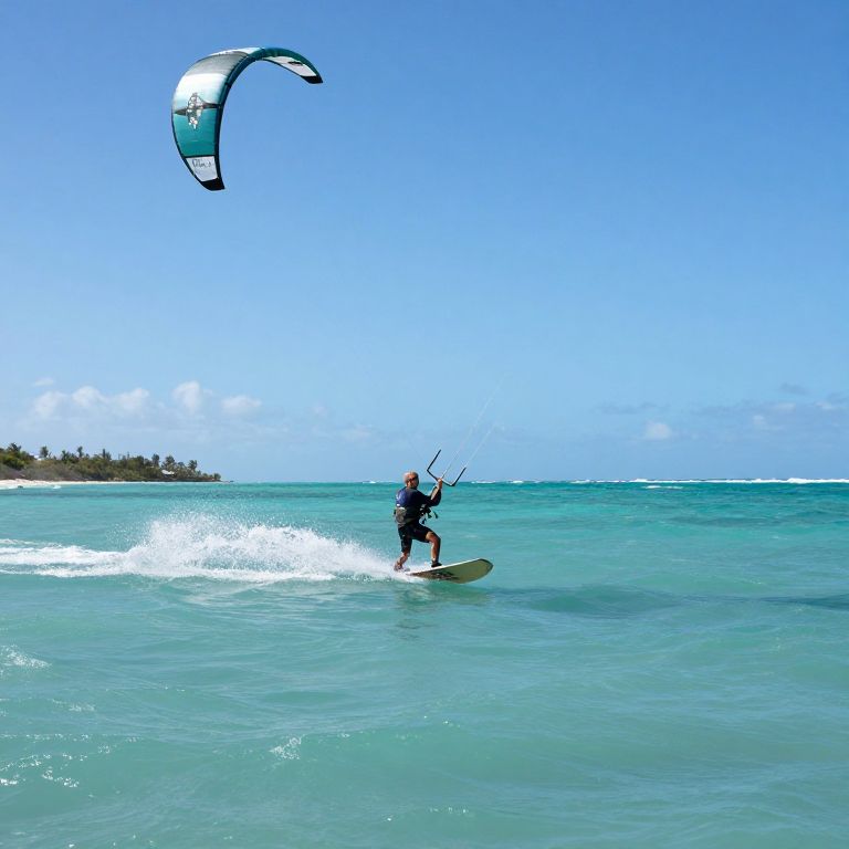 Kiteboarder gliding gracefully across turquoise waters at Silver Rocks, Barbados, with a distant island and clear blue sky as the backdrop.
