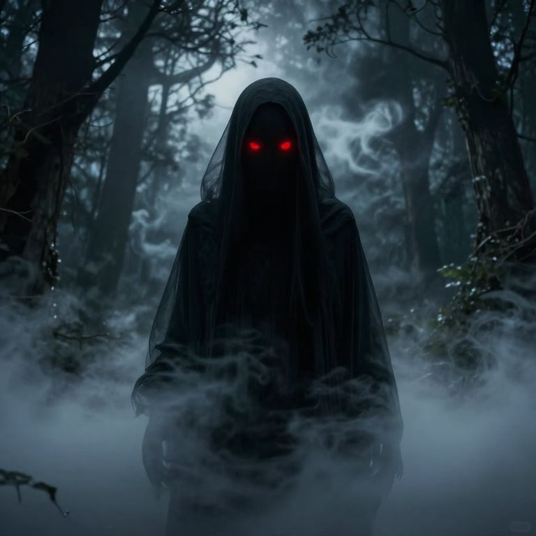 Mysterious ghost with glowing red eyes stands in a foggy, dark forest, enveloped in a black, hooded cloak. Digital artwork.