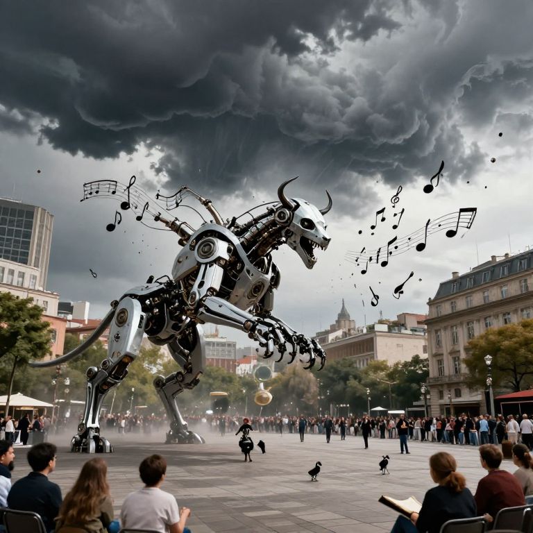 A surreal symphony of tension and wonder unfolds as a storm cloud above the city square transforms into a mechanical beast, raining down musical instruments that harmonize with the ambient hum of life below, weaving a tapestry of existential rhythm and collective consciousness.