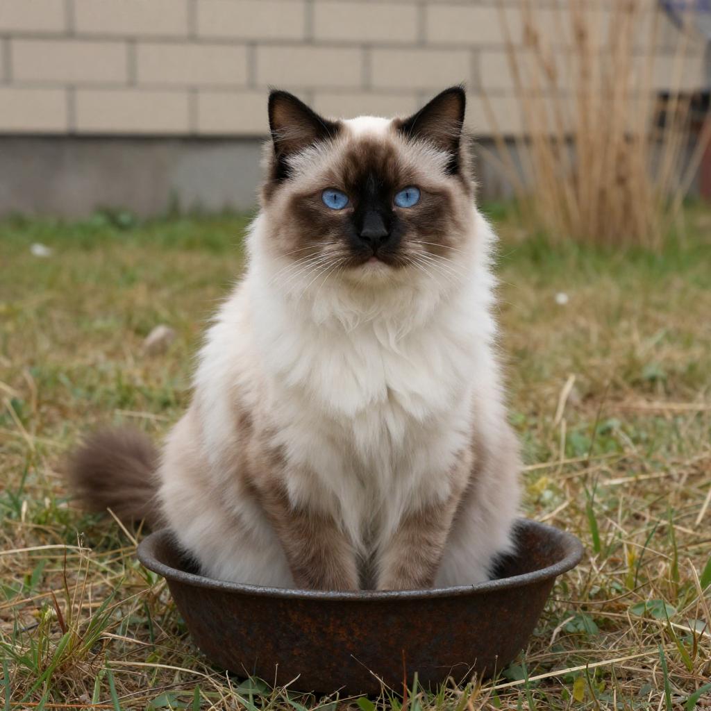 Fluffy Cat on Rusty Bowl in Yard