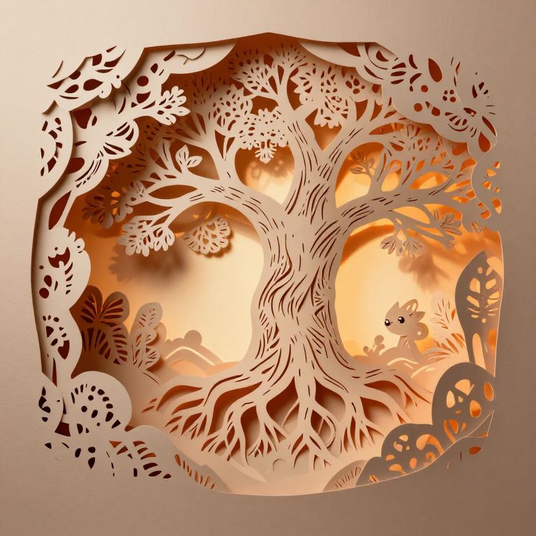 The image is a stunning, multi-dimensional paper cut craft, featuring intricate paper illustrations that create a mesmerizing scene. A tunnel-like structure, resembling a tree hollow, guides the viewer's eye into a captivating interior. Within this hollow, a majestic tree with sprawling roots and branches dominates the space, its trunk twisting and turning in a mesmerizing pattern. The tree is adorned with delicate, ornate patterns that add to its grandeur. A tiny creature, with shiny eyes that gleam, peers out from the depths of the hollow, adding a sense of mystery and wonder. The scene is illuminated by a soft, warm light that highlights the intricate details of the paper cut, casting shadows that enhance the depth and texture of the artwork. The overall composition is balanced, with the tree and the creature positioned centrally, drawing the viewer's attention to the heart of the scene. The interplay of colors, textures, and shapes creates a harmonious and visually striking image that invites the viewer to explore its intricate details.