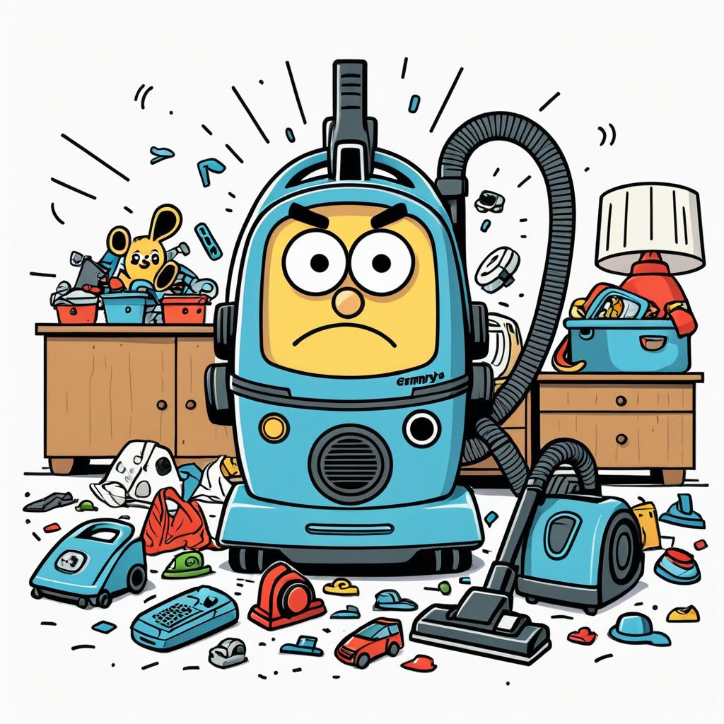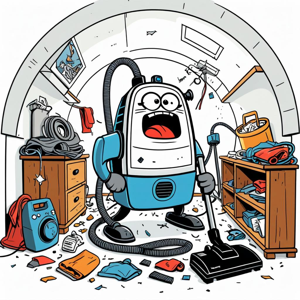Cartoon Grumpy Vacuum Cleaner in Cluttered Attic