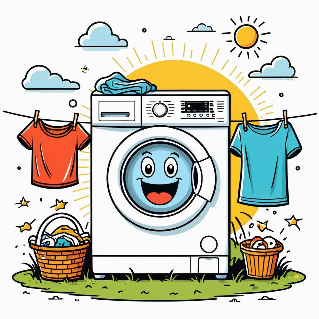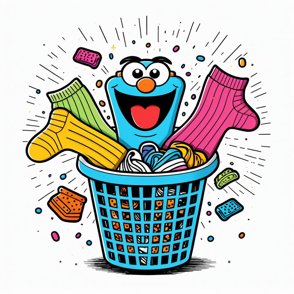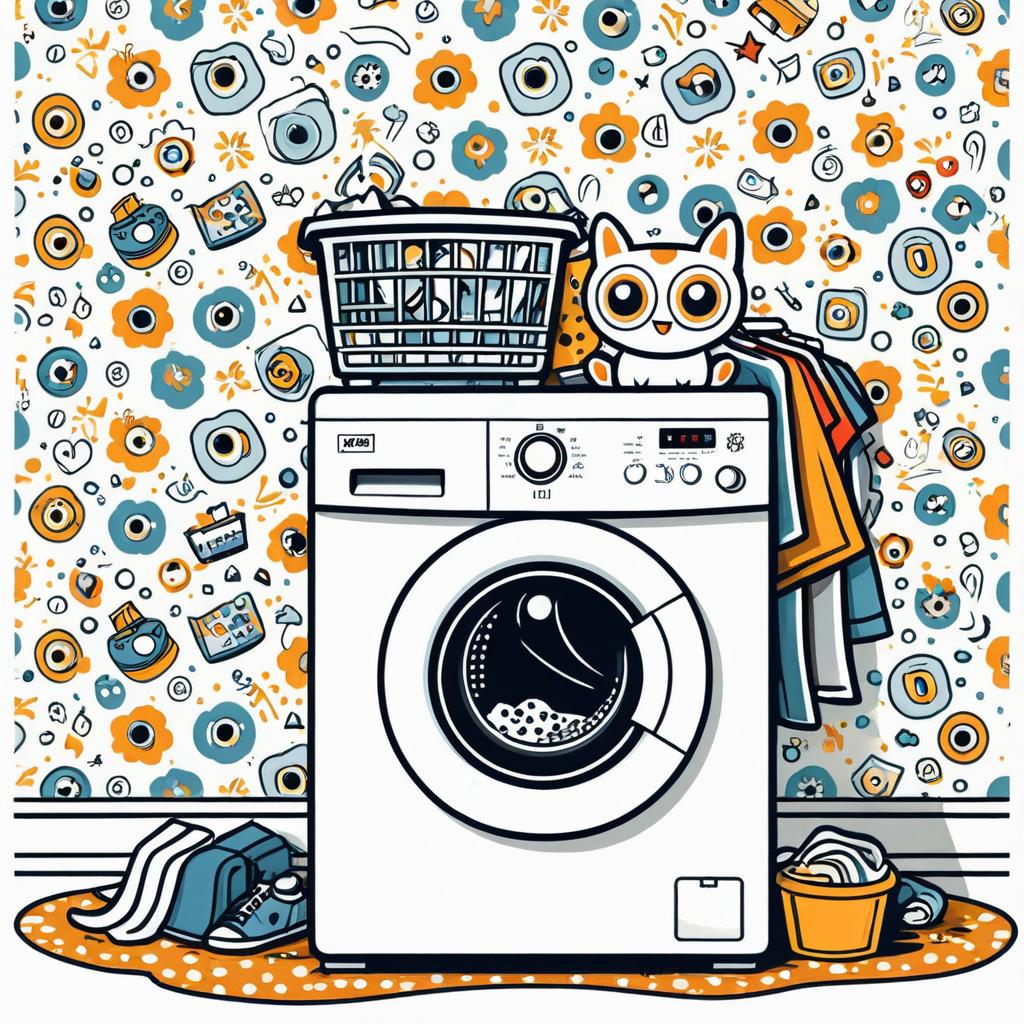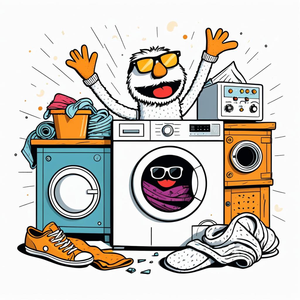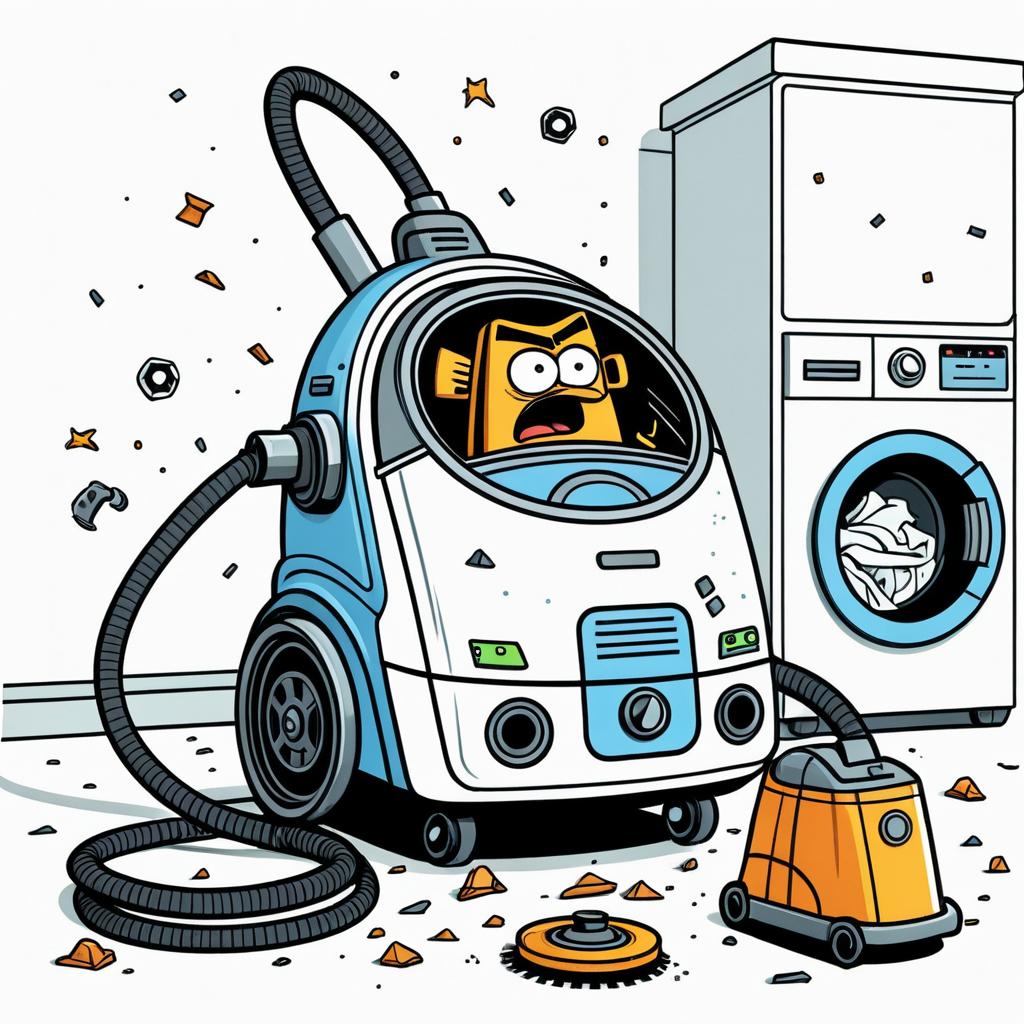 A colorful cartoon illustration of a grumpy vacuum cleaner with eyes and arms, standing in a cluttered attic filled with scattered laundry items and old wooden furniture. The scene features bold contour lines, flat colors, and dynamic lighting on a white background, creating a chaotic and humorous atmosphere. The vacuum is actively causing the mess, highlighting a funny and lively vibe.