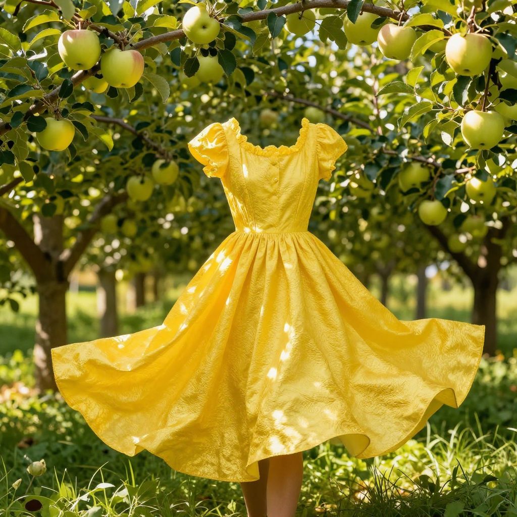 Yellow apple dress flowing in a sunlit orchard, vibrant golden fabric textured like apple skin, surrounded by lush green leaves and ripe apples, whimsical and bright.