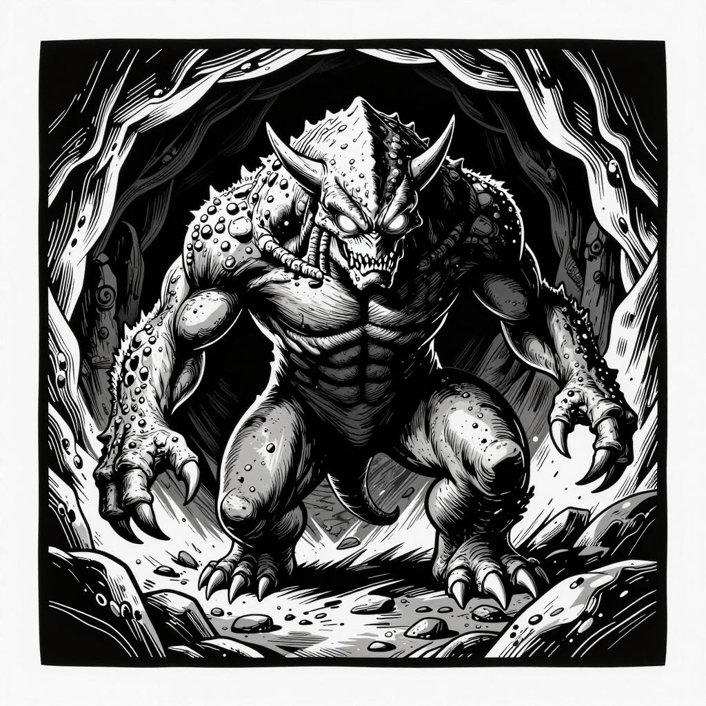 Linocut Style Monster in Cavern
