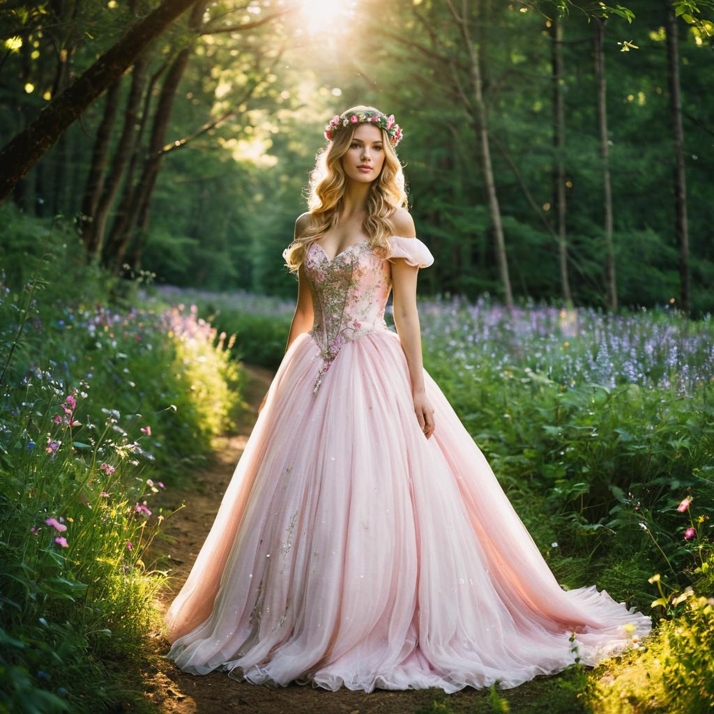 Photorealistic image of a young woman with long wavy blonde hair and fair skin, wearing an elegant off-shoulder pink floral ball gown and a matching floral crown. She stands on a sunlit forest path surrounded by lush greenery and wildflowers during golden hour. The scene exudes a dreamy, ethereal, and romantic atmosphere with soft natural light highlighting detailed textures.