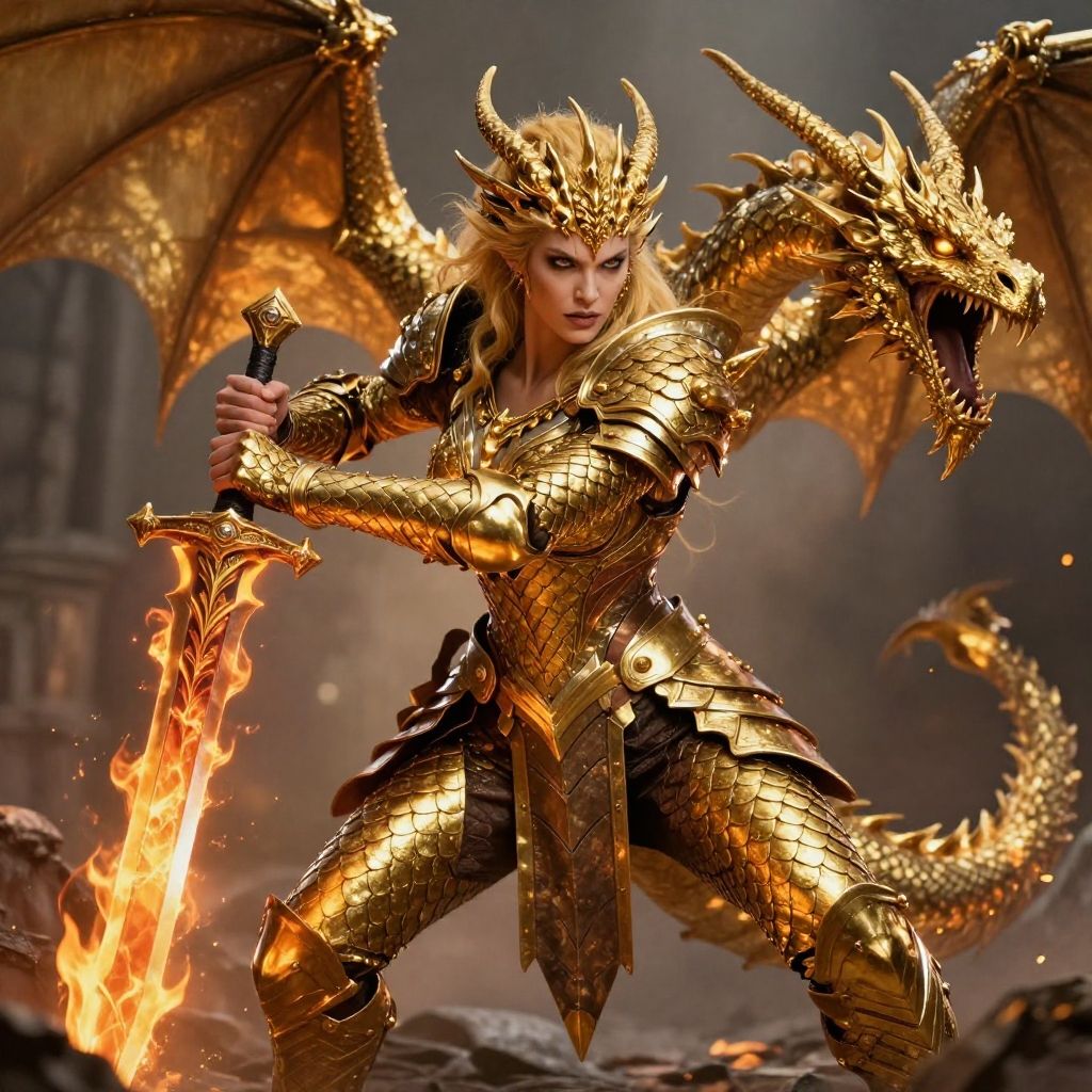Digital CGI of a fierce, green-scaled dragon warrior woman with gold armor, horns, and long tail, holding two large swords, standing confidently against