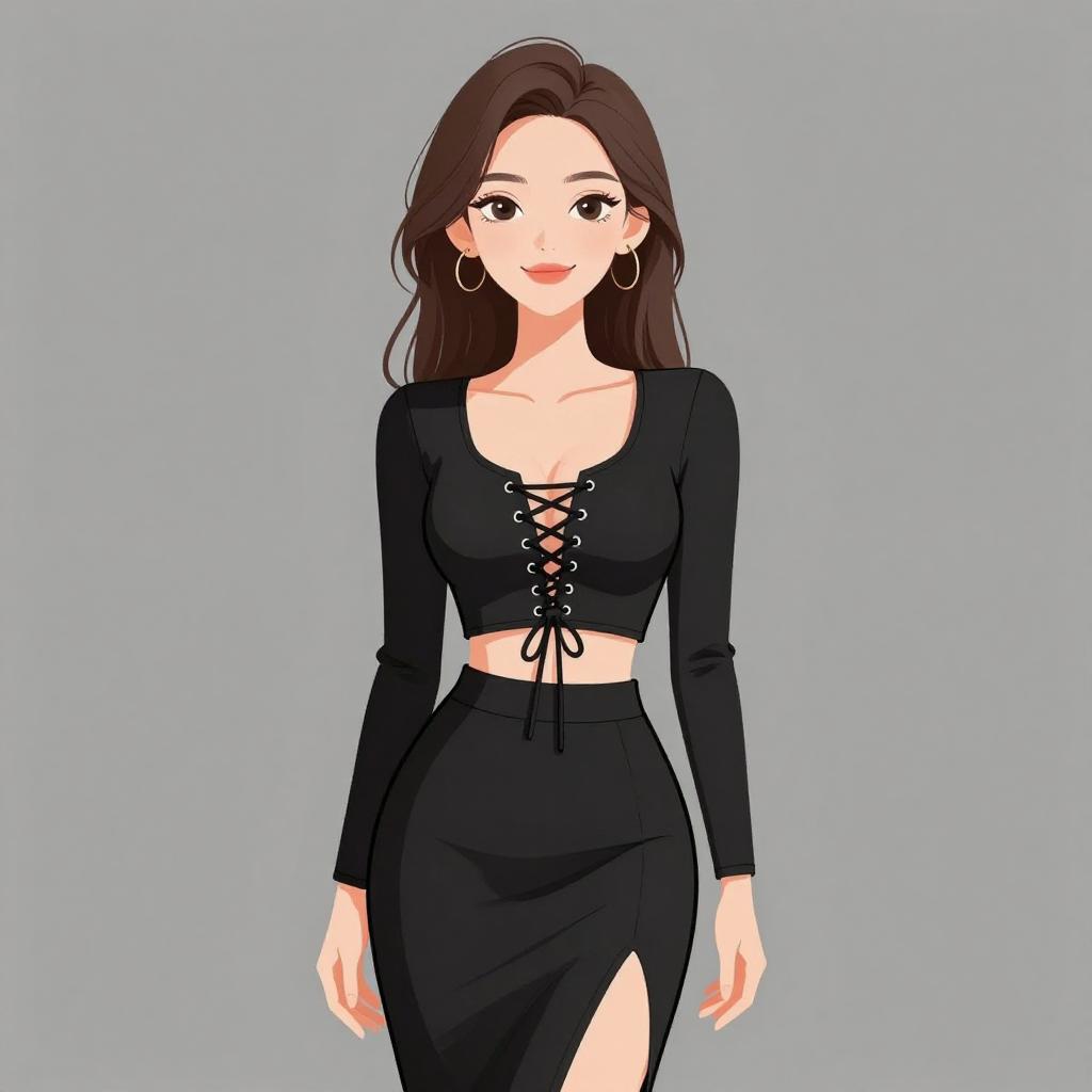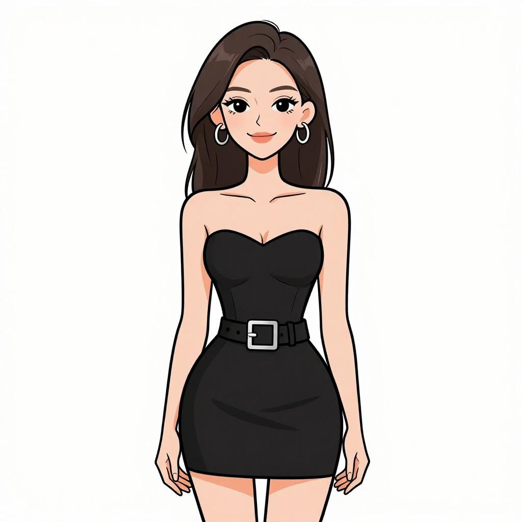 Woman with pretty face and pretty hair. smiling Woman, contemporary chic, black ruched mini dress, crew neckline, sleeveless, adjustable side drawstrings, form-fitting silhouette, large hoop earrings, gold bracelet, slicked-back high ponytail, neutral studio background. --sref 1467