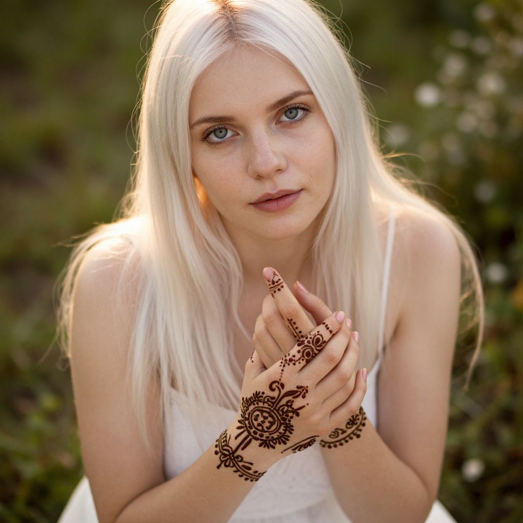 A serene Slavic woman with piercing blue eyes and delicate features sits in a tranquil garden bathed in golden hour light. Her long platinum hair falls gently around her face as she traces intricate henna patterns on her hands, exuding an air of contentment and introspection. The camera angle, from above, captures the soft contours of her porcelain skin and elegant neckline, emphasizing their subtle beauty. This three-quarter view composition evokes a deep connection between nature's tranquility and human emotion.
