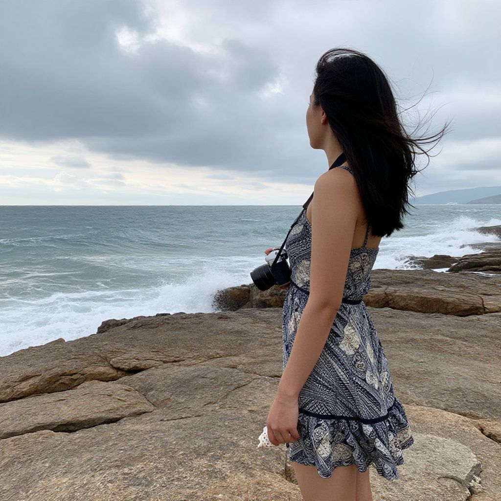 Photograph of a woman with long black hair in a patterned blue and white dress, standing on rocky coastal terrain, facing the ocean under a cloudy