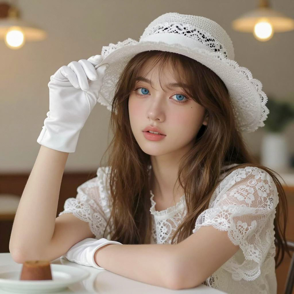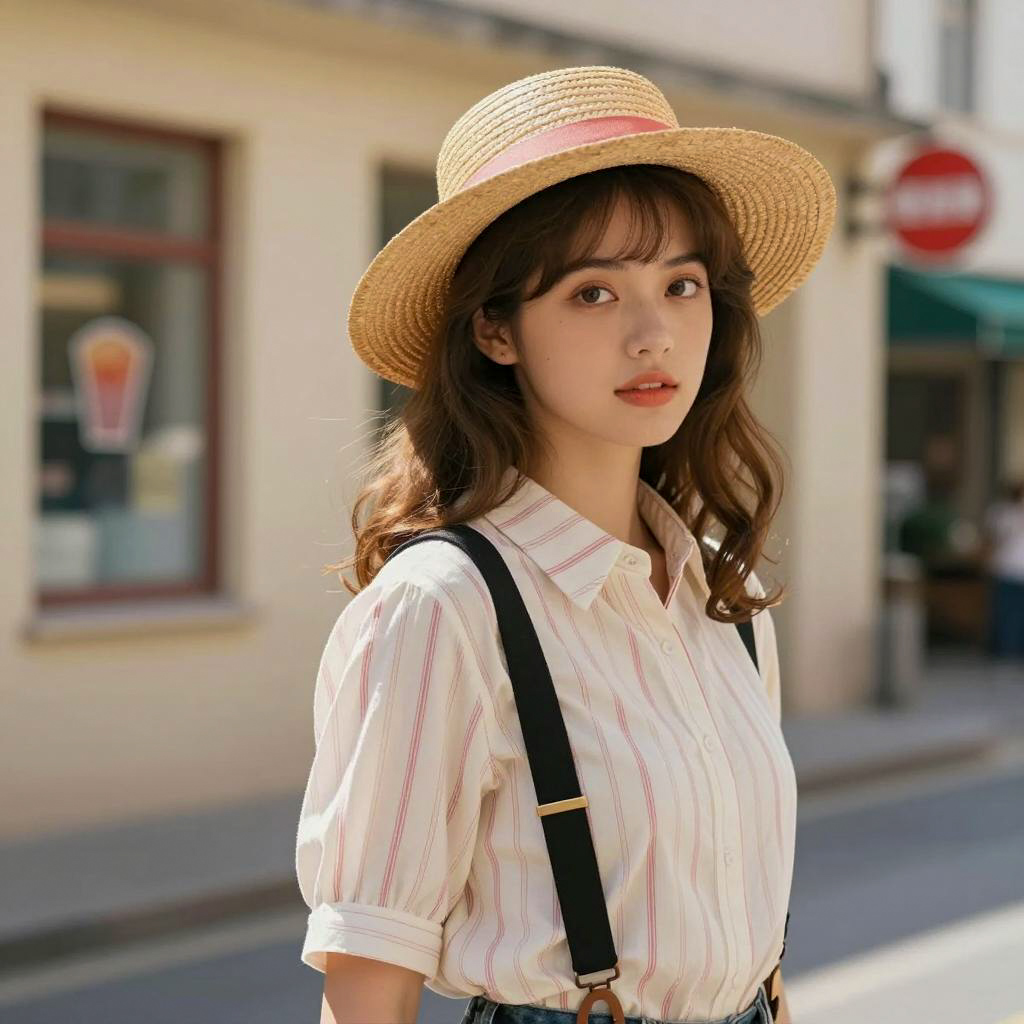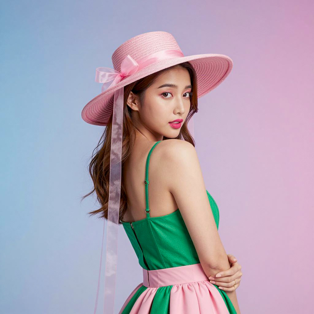 Young Woman in Wide-Brimmed Hat with Pink Bow