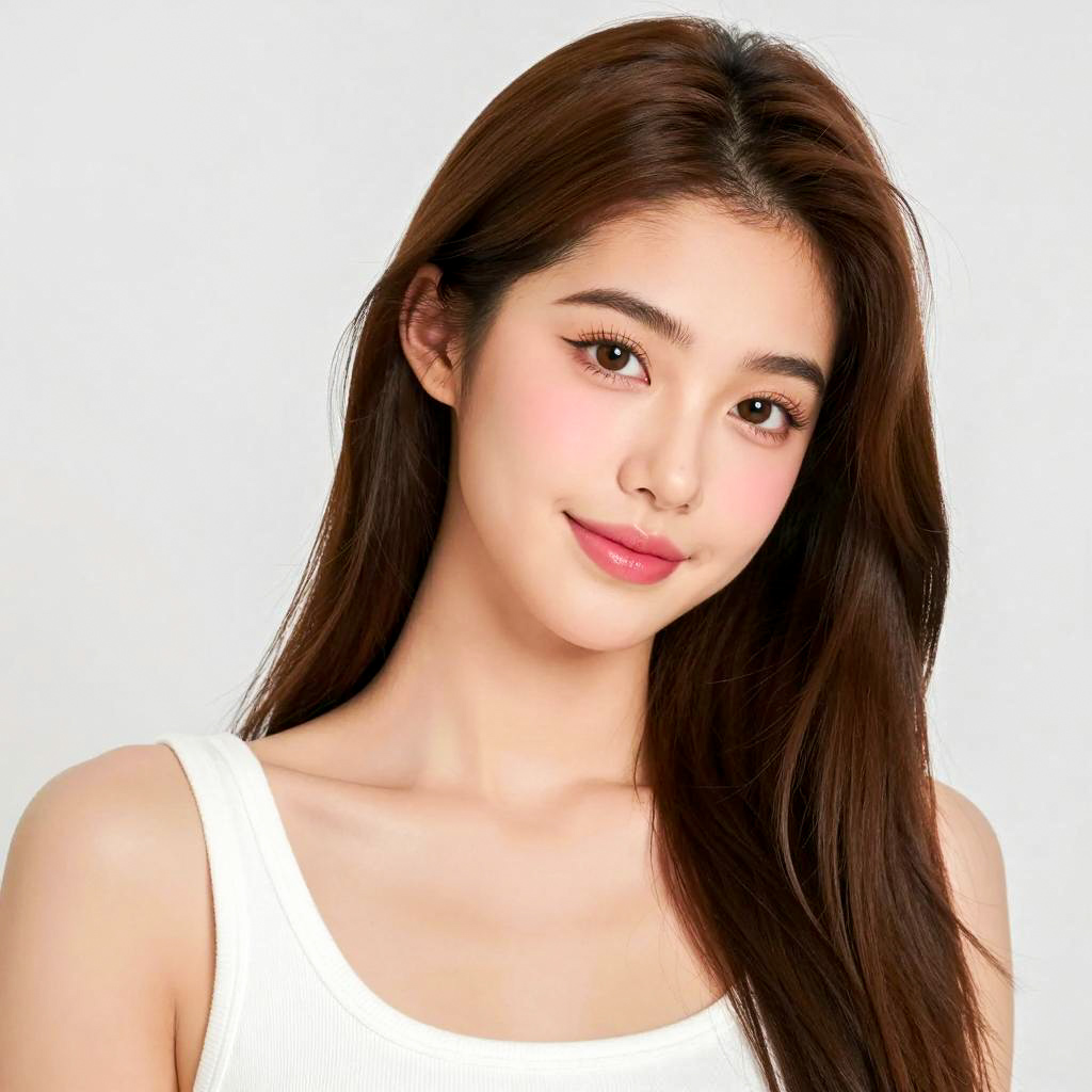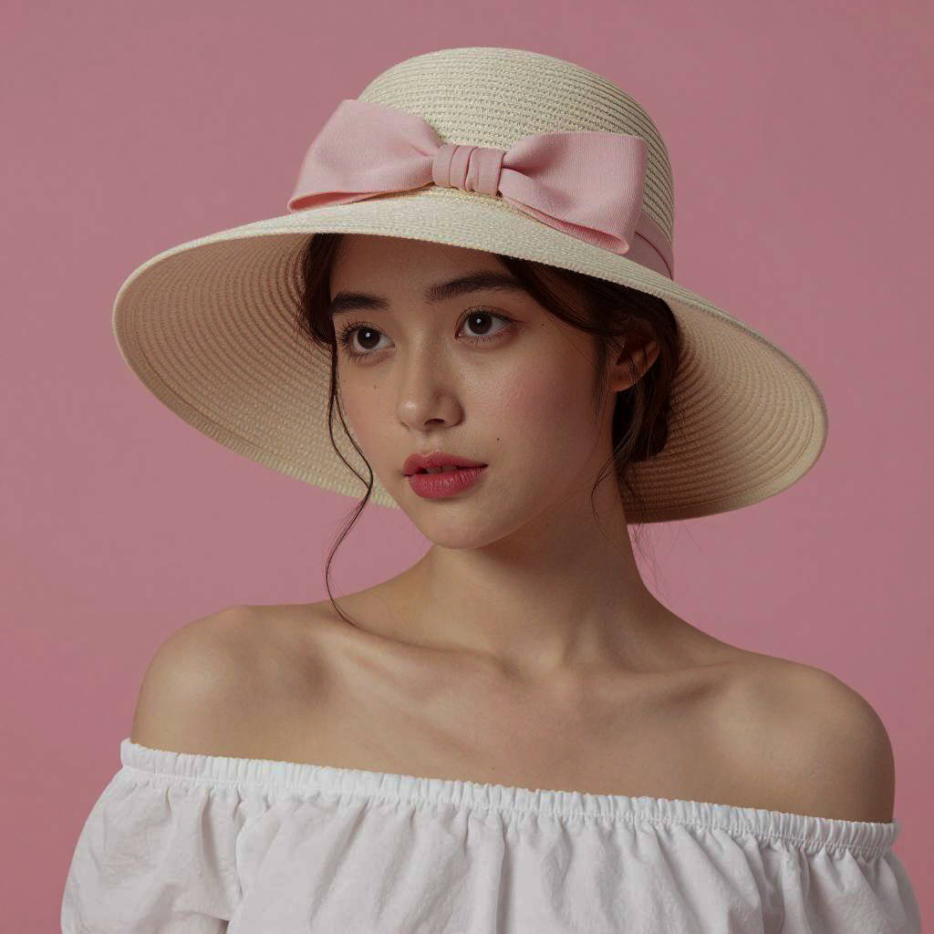 Portrait of a young woman with fair skin wearing a wide-brimmed beige hat adorned with a large pink bow. She has dark brown eyes, soft pink lips, and is dressed in an off-shoulder white top. The background is a solid bright pink, and she gazes slightly to the left with a neutral expression.