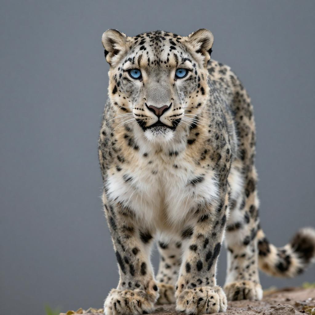 Full body, solo, animal_focus, snow leopard, ice blue eyes, closed mouth, smile, looking at viewer, realistic, grey background