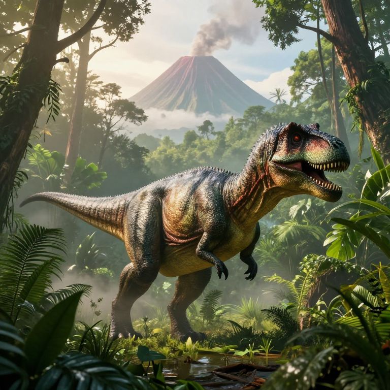 Dinosaurio roaming a dense jungle at dawn, vibrant green foliage surrounding massive reptilian creature, mist rising from the swampy ground, detailed scales glistening in soft sunlight, prehistoric atmosphere with towering ancient trees and distant volcano smoke.
