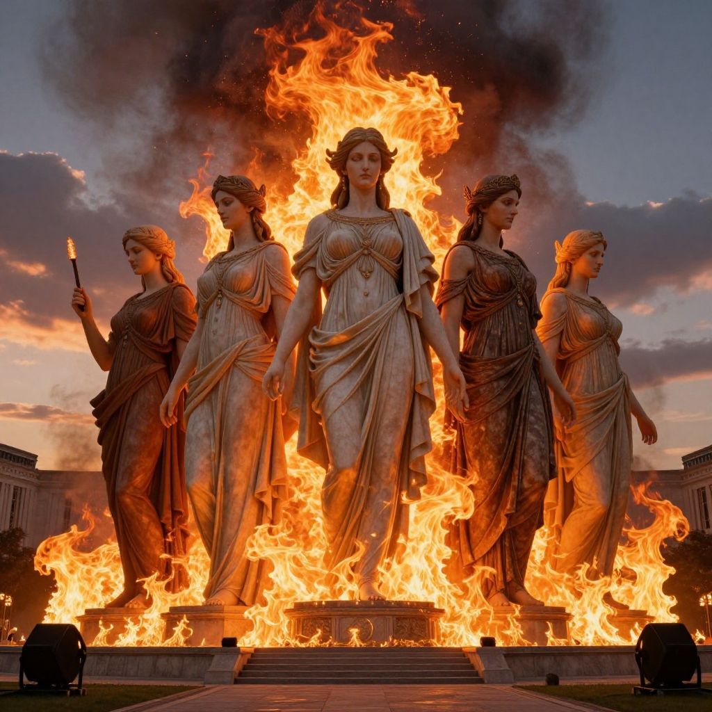 Photograph of four classical-style stone statues of women, standing in a row and engulfed in bright, roaring flames. The statues, with detailed drapery and serene expressions, are illuminated by the fire. The central figure holds a torch in her right hand, while the other statues have their hands gracefully positioned. The background features a dramatic, cloudy sky with hues of orange and blue. The statues are set on a stone platform, with intense flames consuming the base. The scene evokes a sense of both ancient grandeur and fierce destruction.