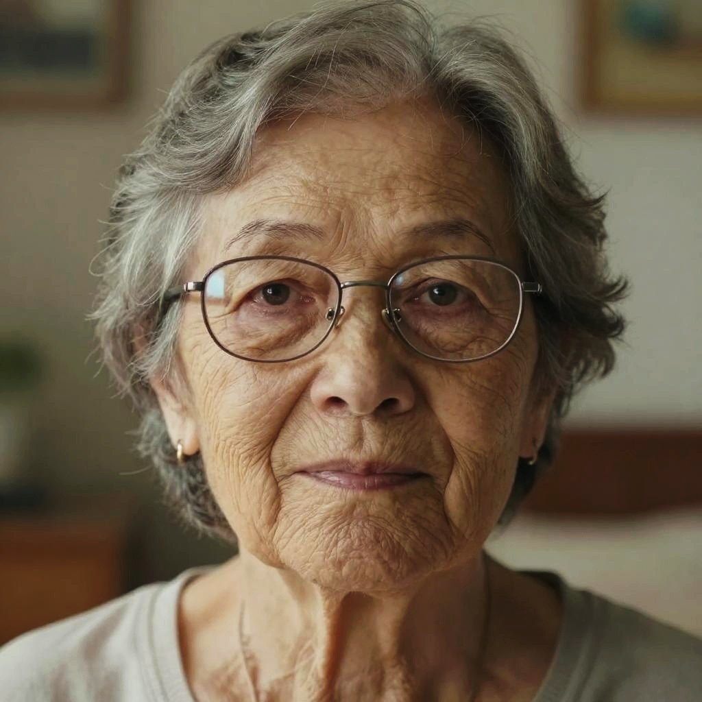 Photograph of an elderly African American woman with deep brown skin and short, curly gray hair. Her face is prominently centered, showing deep-set brown eyes, slightly furrowed brows, and full, slightly downturned lips with a natural, matte brown lipstick. She wears small, simple silver earrings and a dark, neutral-colored top. The background is a plain, light gray, which contrasts with her skin tone and hair color, highlighting her facial features. Her expression is calm and composed, with a subtle, gentle smile. The image focuses on her face, capturing fine lines and textures, emphasizing her wisdom and dignity.