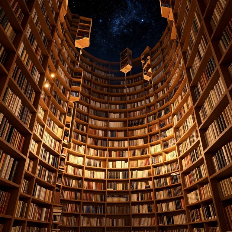 An atmospheric 3D-rendered library bathed in warm, golden-hour lighting, featuring towering bookshelves that stretch toward a starry night sky, evoking a cyberpunk aesthetic where gravity-defying shelves rearrange themselves into celestial patterns each midnight, blending retro fantasy with futuristic intrigue.