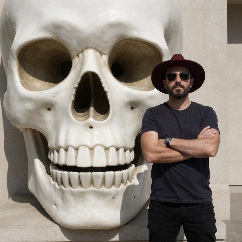 Man standing with arms crossed, wearing dark shirt, black pants, red hat, sunglasses, next to large white skull sculpture, against stone wall. Skull has large teeth, hollow eyes, nose, and mouth. Sunlight casts shadows. Man has short beard.