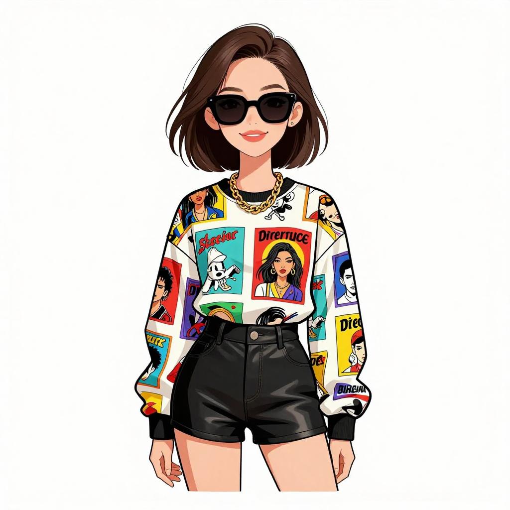 Woman with pretty face and pretty hair. smiling Woman, trendy fashion, graphic print sweatshirt with pop culture motifs, long sleeve, crew neck, black leather high-waisted shorts, fitted silhouette, oversized black sunglasses, chunky gold chain necklace. --sref 1467