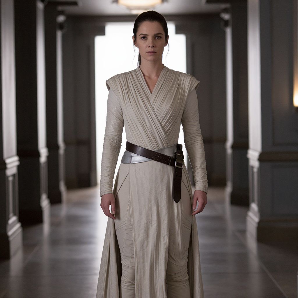 Rey Costume Rise Skywalker, a woman in a dress and a belt standing in a hallway