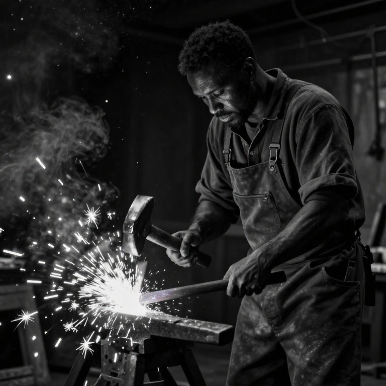 A black-and-white photograph depicts a muscular Black man with short curly hair, wearing a dark, worn apron over a collared shirt, focusing intently as he strikes a glowing piece of metal with a hammer, creating a burst of bright, sparkling sparks. The man stands in a dimly lit workshop, with blurry industrial equipment and tools in the background. The high contrast emphasizes the intensity of the sparks and the man's concentrated expression. The image captures the textures of the metal, the ruggedness of his apron, and the dynamic energy of the sparks.