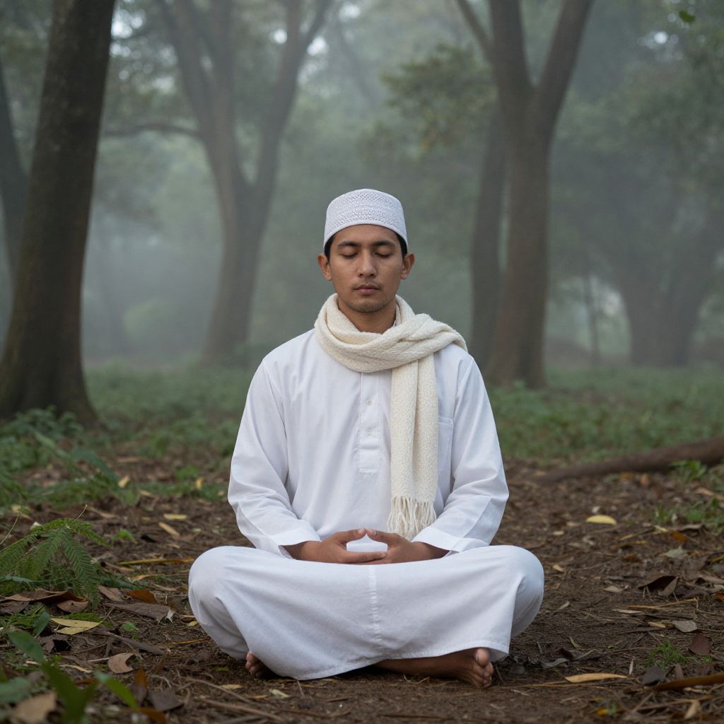 A calm Muslim man meditates in a quiet forest clearing, wearing a simple white tunic and a woolen scarf, hands placed gently on his lap. The trees are dense with morning fog, reflecting inner stillness and devotion to spiritual practice.